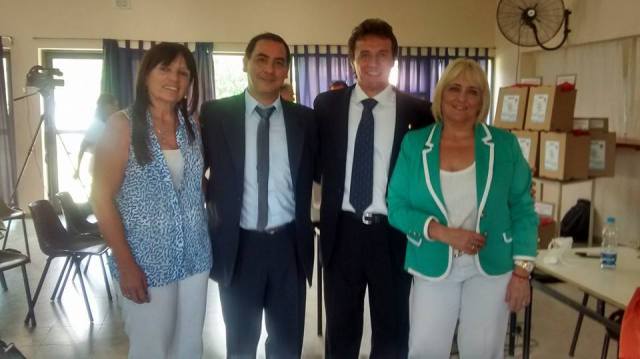 La intendente de Merlo Gloria Petrino, los farmacéuticos Marcelo García y Rodi Poblete y la legisladora Ivana Bianchi.