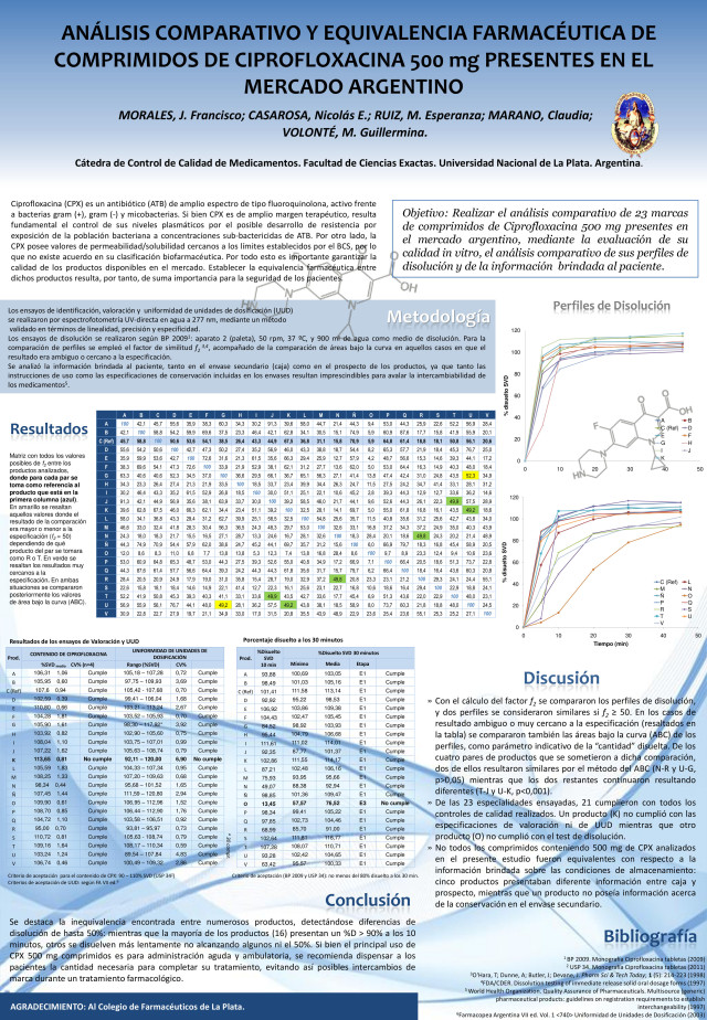 En esta oportunidad los colegas MORALES, J. Francisco; CASAROSA, Nicolás E.; RUIZ, M. Esperanza; MARANO, Claudia y VOLONTÉ, M. Guillermina, concluyeron que en el análisis comparativo y equivalencia farmacéutica de comprimidos de Ciprofloxacina 500 mg presentes en el mercado argentino se destaca la inequivalencia encontrada entre numerosos productos, detectándose diferencias de disolución de hasta 50%: mientras que la mayoría de los productos (16) presentan un %D > 90% a los 10 minutos, otros se disuelven más lentamente no alcanzando algunos ni el 50%.