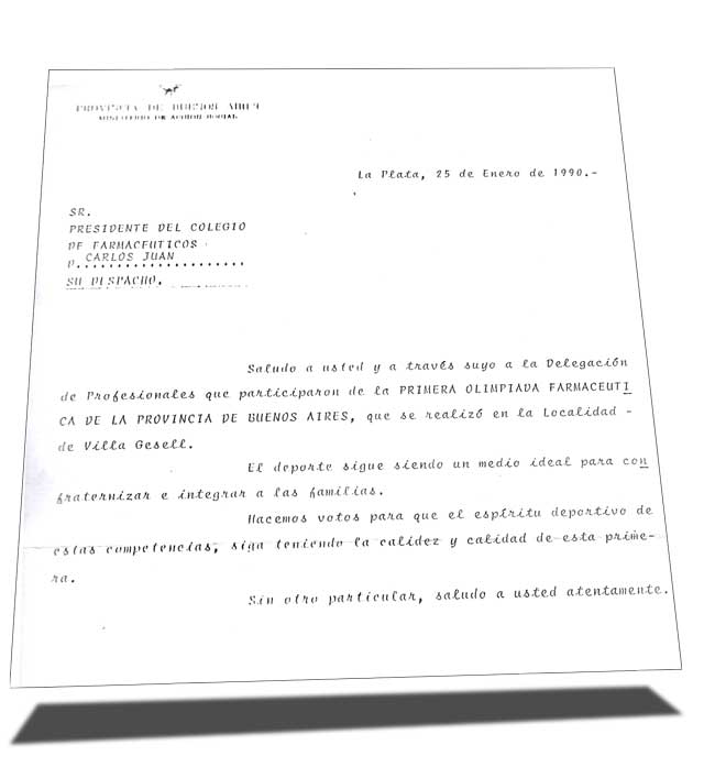 Ese día, al término de aquella reunión, se acercó a nosotros el secretario del Colegio de Farmacéuticos de la provincia, el colega Mario Castelli quien nos invitó al Colegio Central para que charláramos sobre la organización de los primeros juegos farmacéuticos de la provincia de Buenos Aires.