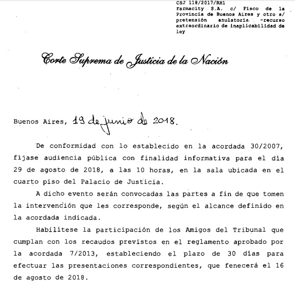 ¿A qué se debe esto? A una medida de la Corte Suprema de Justicia que convocó a una audiencia pública informativa en el marco de la causa CSJ 118/2017/RH1 “Farmacity S.A. c/ Fisco de la Provincia de Buenos Aires y otro s/ pretensión anulatoria -recurso extraordinario de inaplicabilidad de ley”.