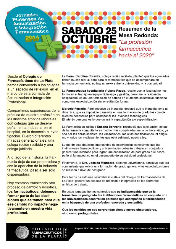 Agradecemos que se piense en el farmacéutico, en como nos preparamos para los próximos años y como formamos parte de esos cambios y que siempre alguien tiene que comenzar, en este caso fue la filial La Plata.