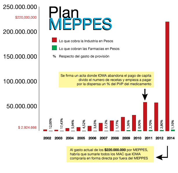 | Como se puede ver en las presentaciones mensuales del año 2014, el IOMA dispuso para los farmacéuticos la irrisoria suma promedio de $ 2.500.000; mientras que para la provisión de los Medicamentos de Alto Costo estableció en favor de la Industria la suma de $ 220.000.000, con una bonificación que apenas alcanza el 23% (promedio ) del PVP.A la fecha los farmacéuticos percibimos un porcentaje que no llega a un 1% (promedio) del PVP del medicamento que estamos dispensando, un valor que desde el 2011 no se ha actualizado.