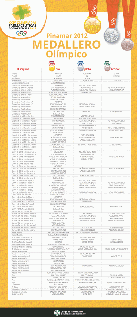 COMPARTIMOS EL MEDALLERO OLIMPICO FARAMACEUTICO 2012. LA PLATA FUE LA GRAN PROTAGONISTA DE LAS JORNADAS CON UNA DELEGACION NUMEROSY GRAN CANTIDAD DE PREMIOS.