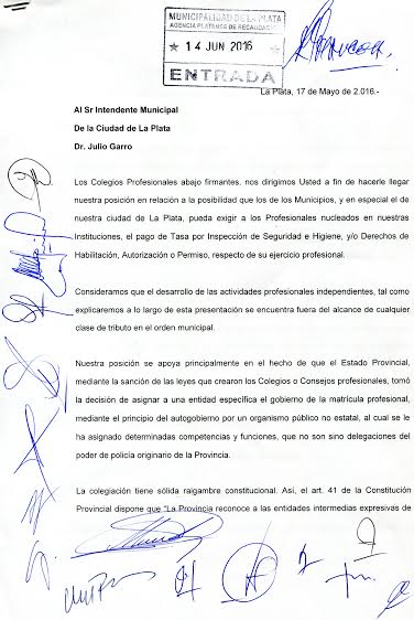 Es así como en la presentación fechada el 17 de mayo del corriente y con la firma de los representantes profesionales, se planteó de manera directa al Intendente Julio Garro que a través de las leyes de creación de los Colegios Profesionales “resultan ser las propias entidades profesionales las que poseen la competencia indelegable, exclusiva y excluyente para regular lo atinente al ejercicio de la profesión –en el marco de la propia ley-, y en particular, el poder de policía, incluso con relación al espacio físico en donde se desarrolla la actividad. En virtud de ello, consideramos que deviene improcedente cualquier intención municipal de arrogarse la facultad de controlar el ejercicio de las actividades profesionales y de los lugares físicos donde se desarrollan las mismas, con el argumento de regular la salubridad, higiene y seguridad de los mismos”.