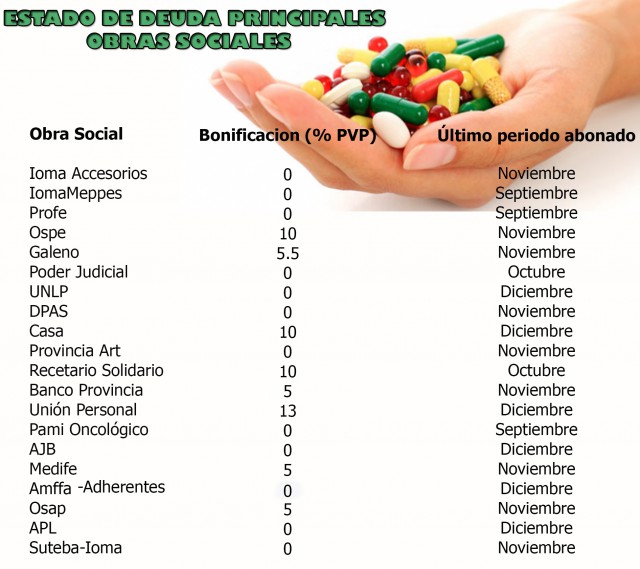 En nuestro partido hay dos grandes Obras Sociales que generan la mayor demanda de medicamentos y accesorios: PAMI y IOMA. La primera tiene una bonificación promedio para La Plata de 16% y la segunda un 7%, y ambas tienen varios planes de cobertura que pueden llegar hasta el 100% del valor del producto.