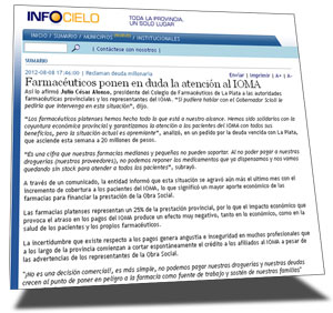 EL MIERCOLES 8 DE AGOSTO NUESTRA FILIAL PLATENSE EMITIO UN COMUNICADO A LOS MEDIOS DENUNCIANDO EL ATRASO EN LOS PAGOS DEL IOMA Y LA GRAVE SITUACION QUE PADECEN NUESTRAS FARMACIAS POR LA IMPREVISIBILIDAD Y LA IRREGULARIDAD DE LOS PAGOS DE LA SEGURIDAD SOCIAL