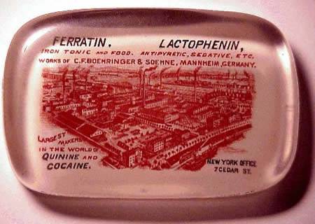 Un pisapapeles de propaganda, de C.F. Boehringer & Soehne (Mannheim , Alemania), «los mayores fabricantes del mundo de quinina y cocaína».