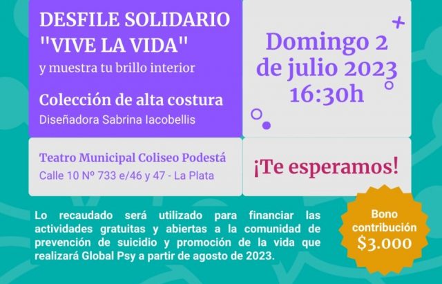 El evento es organizado por ONG Globalpsy en conjunto con la diseñadora de alta costura Sabrina Iacobellis. Asimismo, nuestra Filial y diversos colegas se suman como colaboradores en lo que refiere a la logística de venta de entradas. Cabe destacar que el dinero recaudado será utilizado para financiar las actividades de prevención de suicidio y promoción de la vida que llevará adelante la ONG a partir de agosto de 2023.